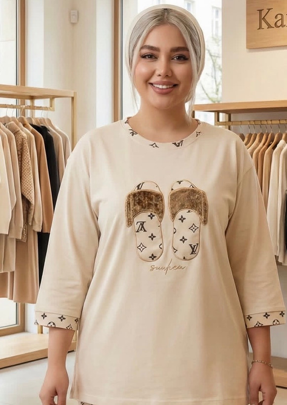 تیشرت لانگ طرح دمپایی پشمالو آستین سه ربع جنس سوپر پنبه