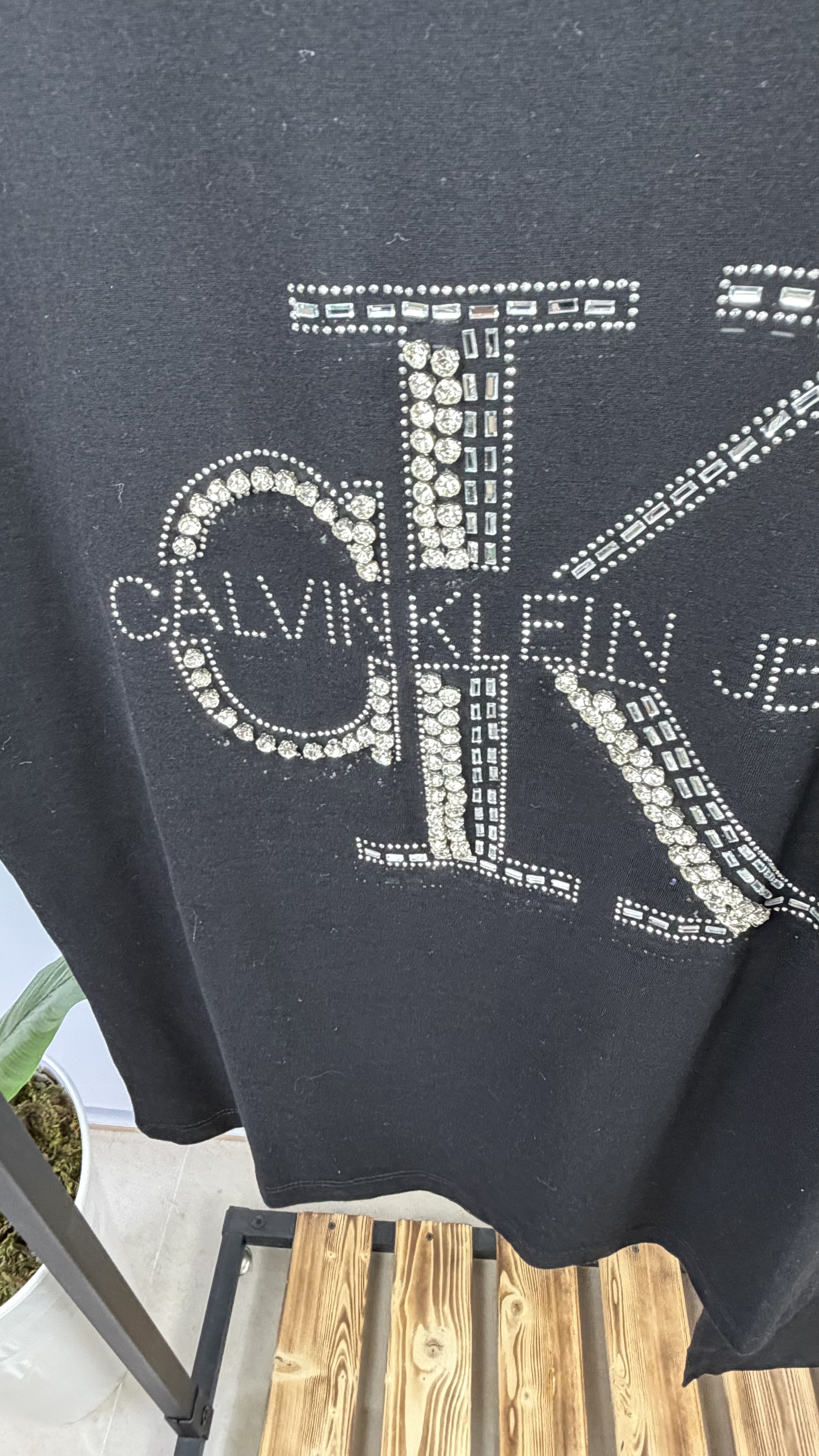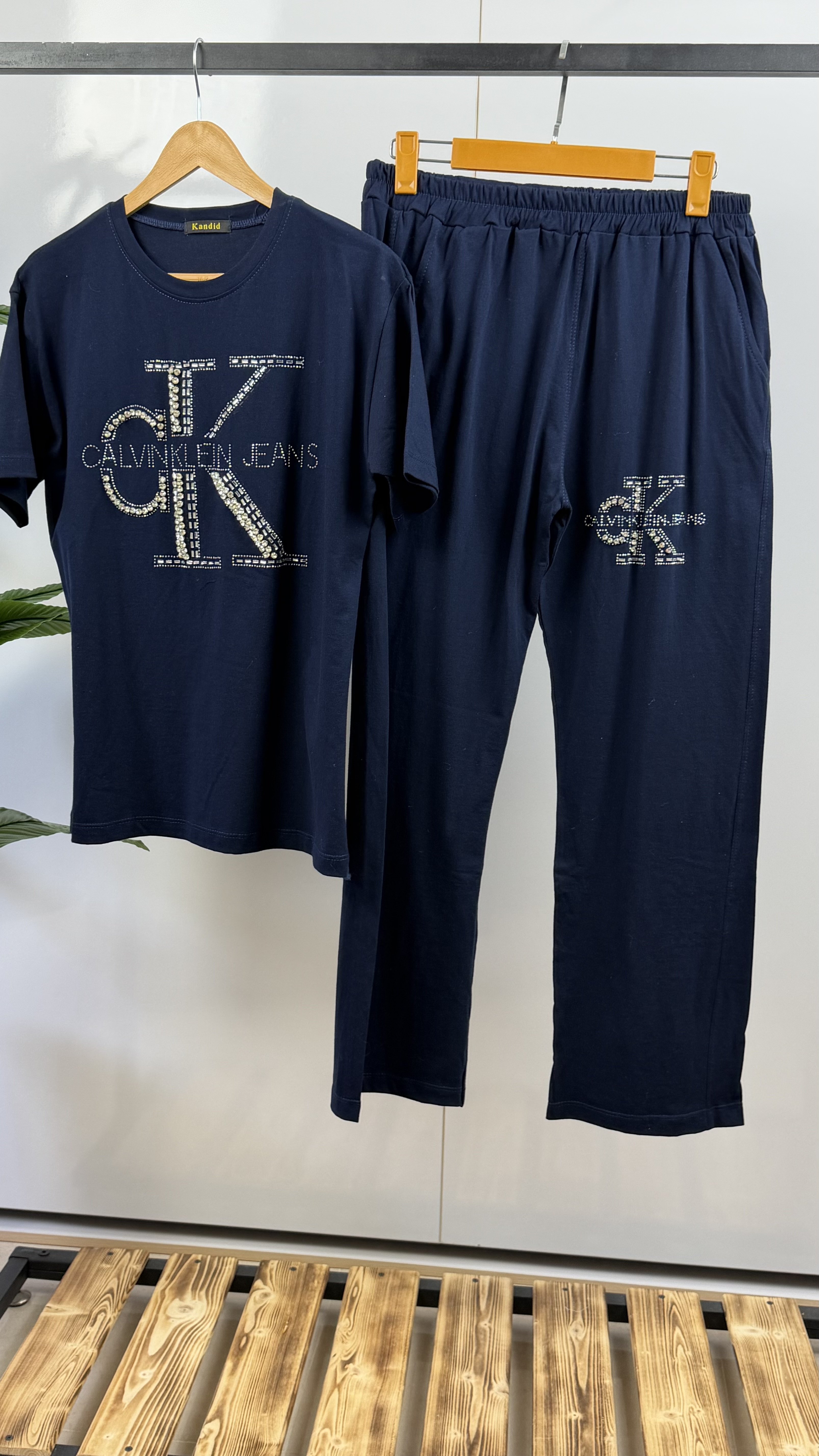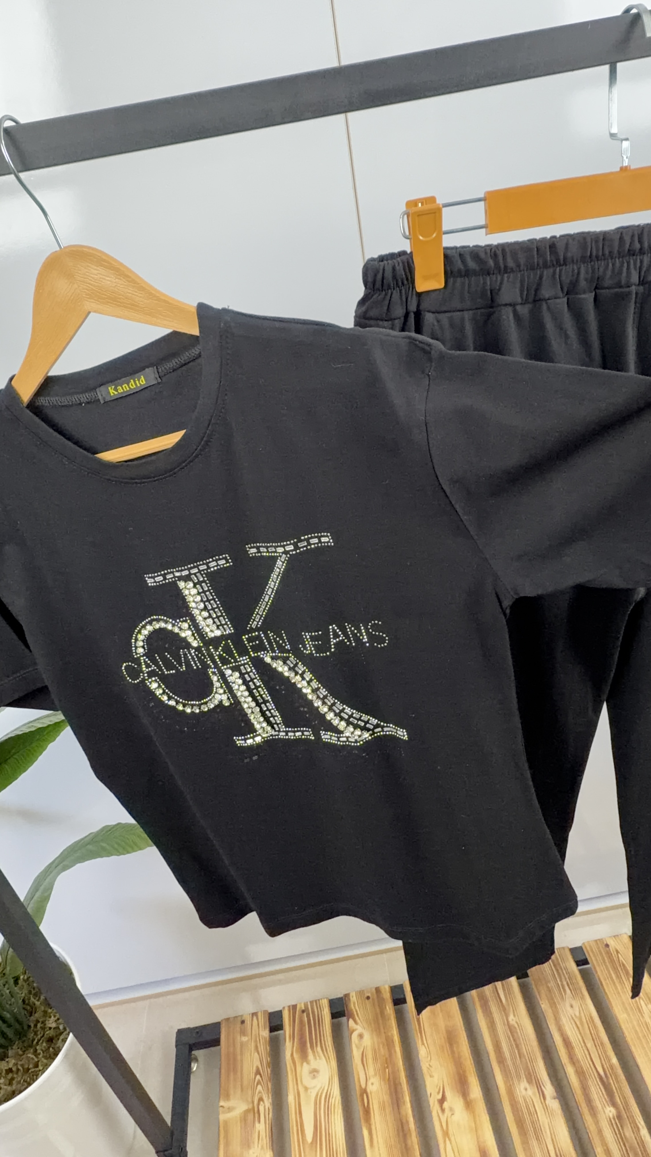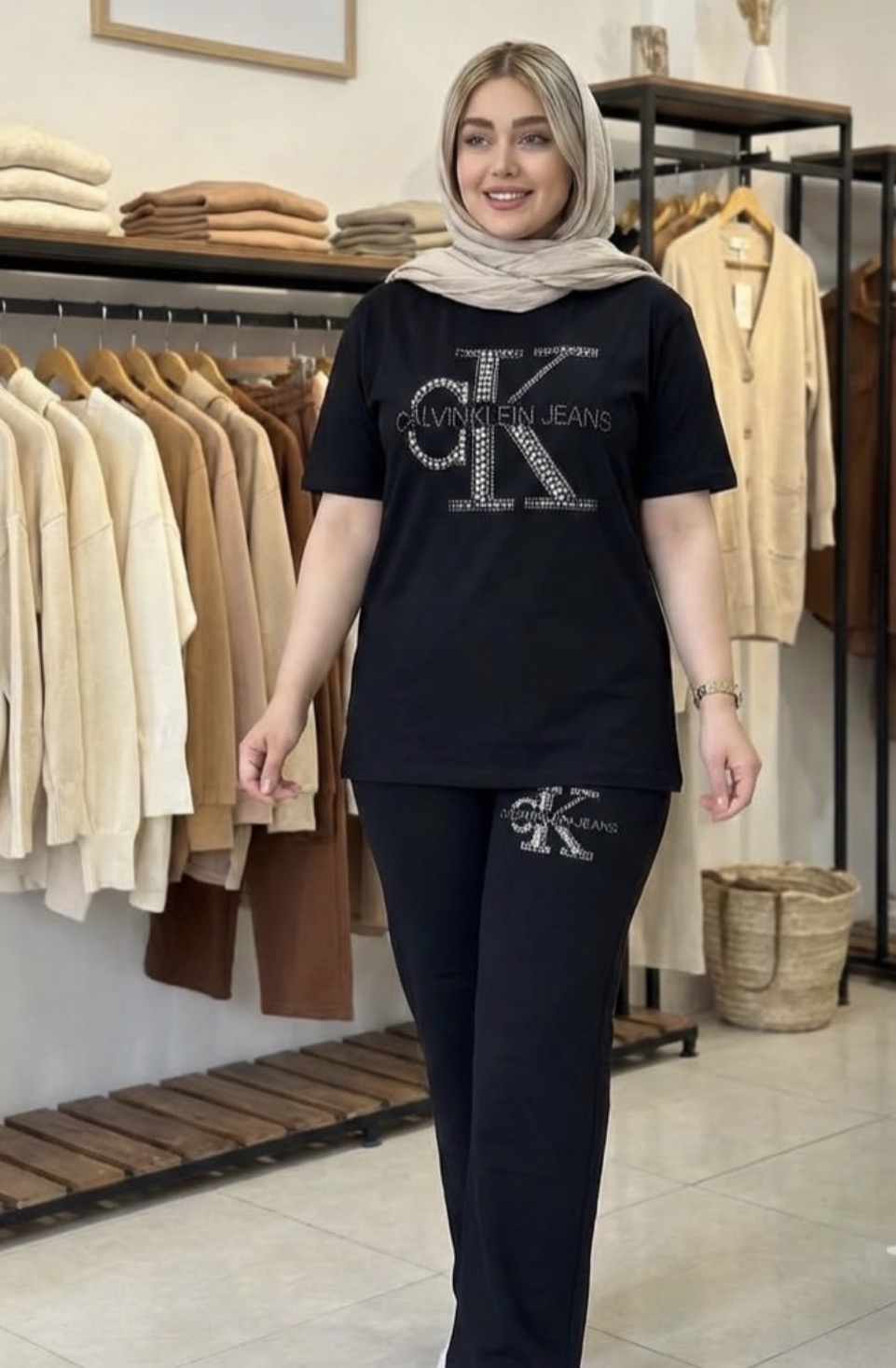 جلوی تیشرت و روی ران شلوار نوشته CK با ترکیب سنگ و نگین بسیار لباس رو خاص و جذاب تر کرده