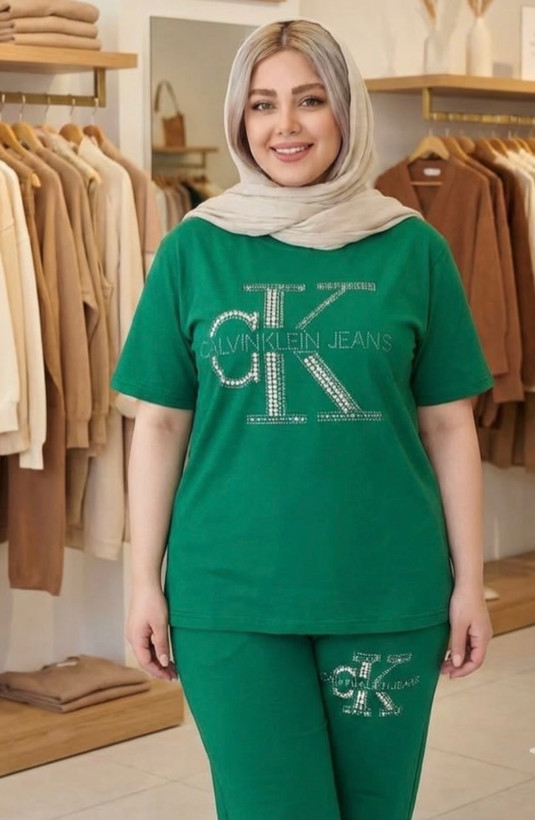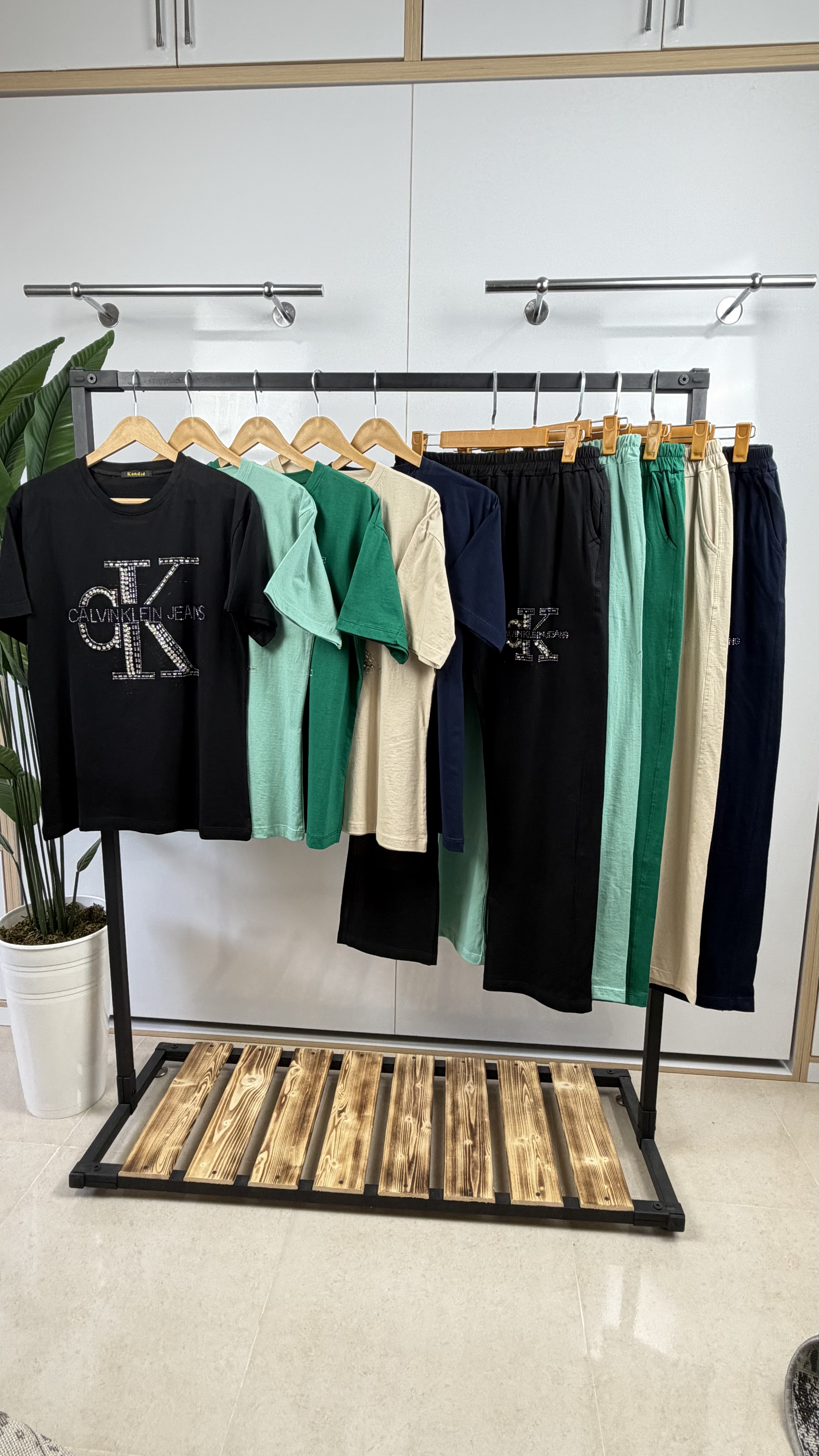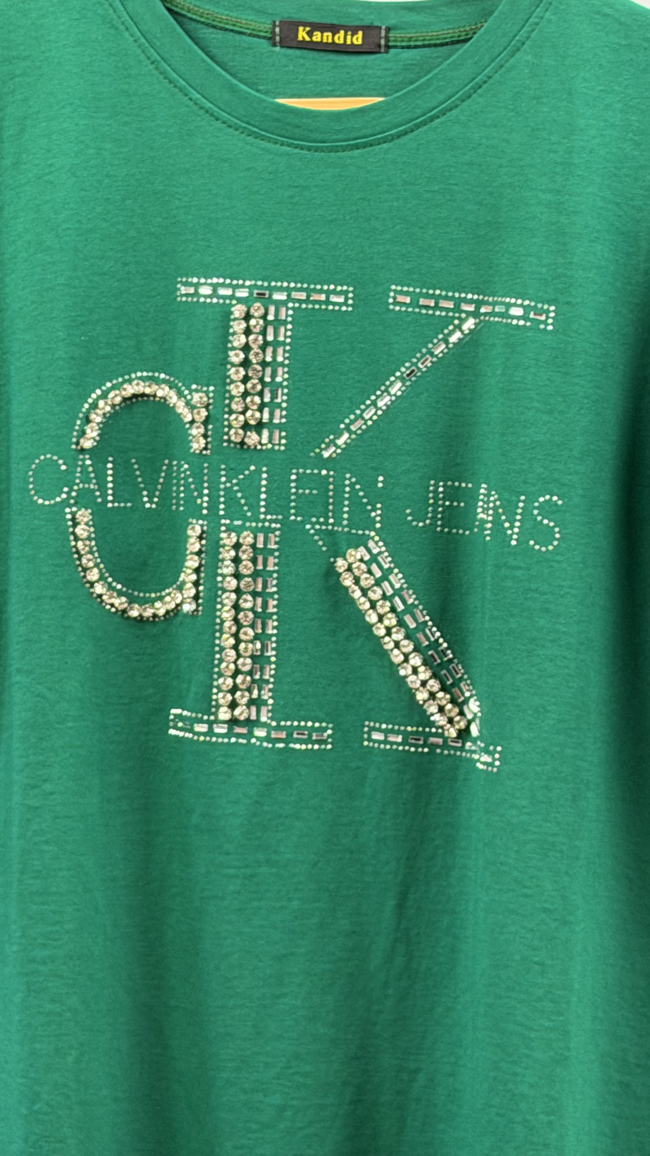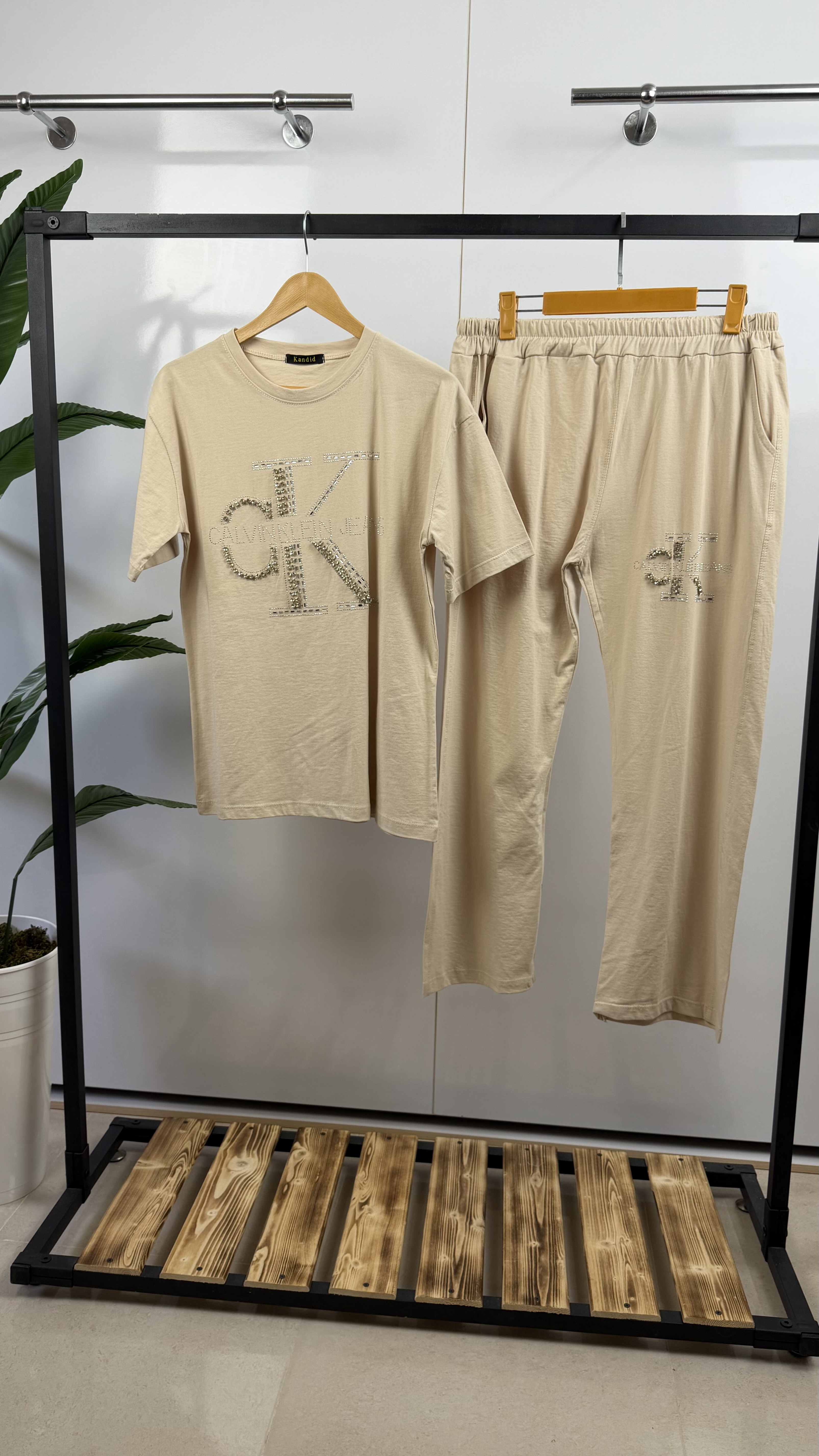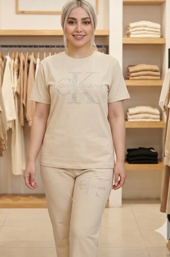 جلوی تیشرت و روی ران شلوار نوشته CK با ترکیب سنگ و نگین بسیار لباس رو خاص و جذاب تر کرده