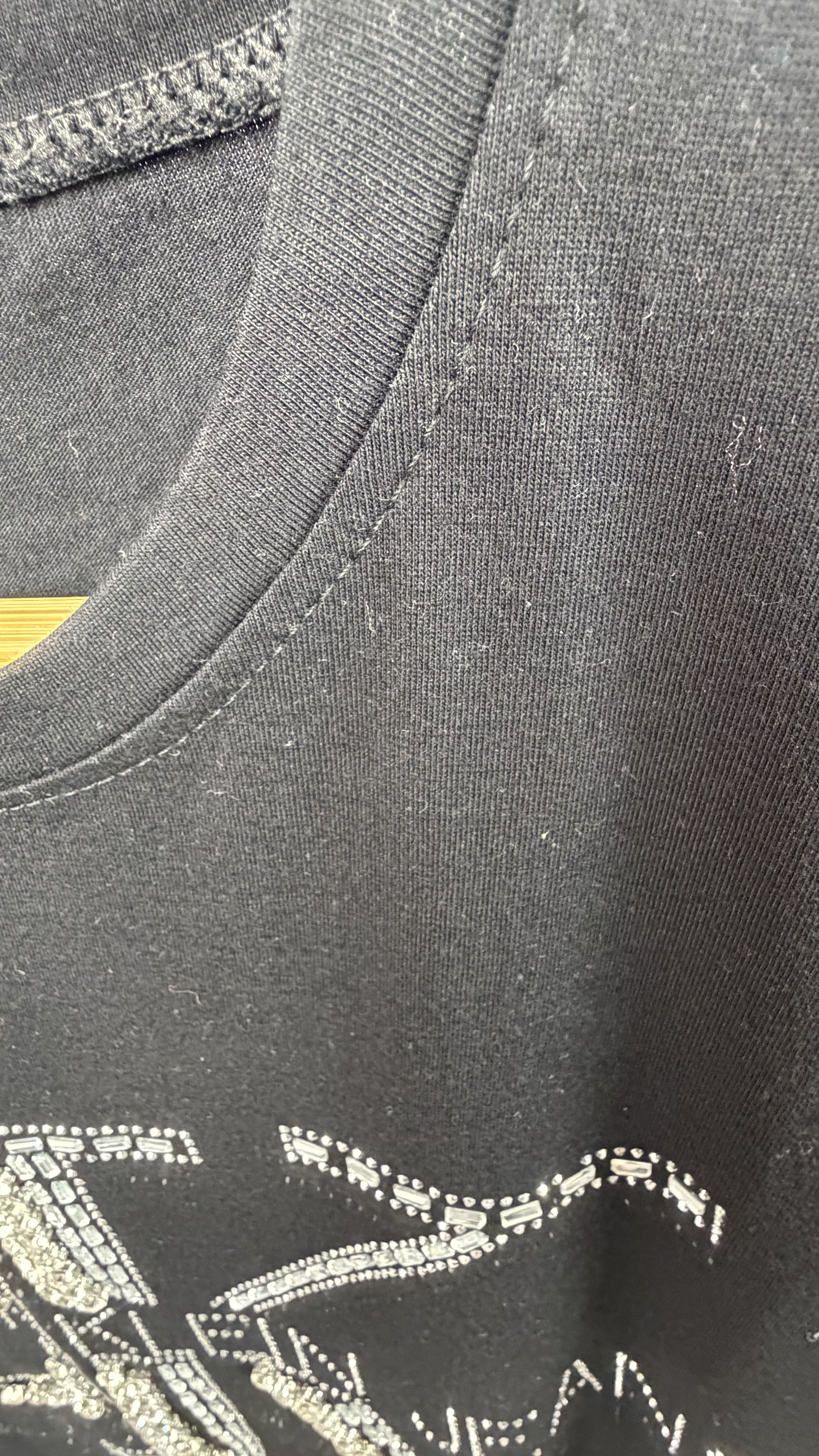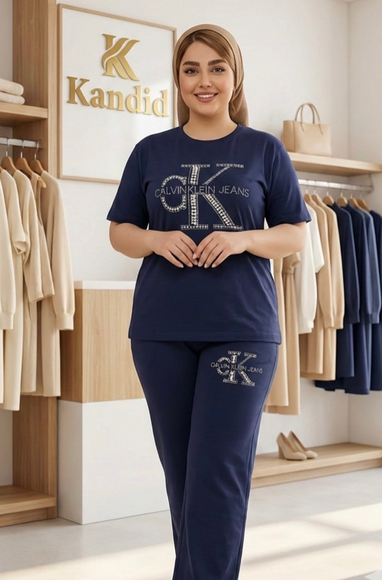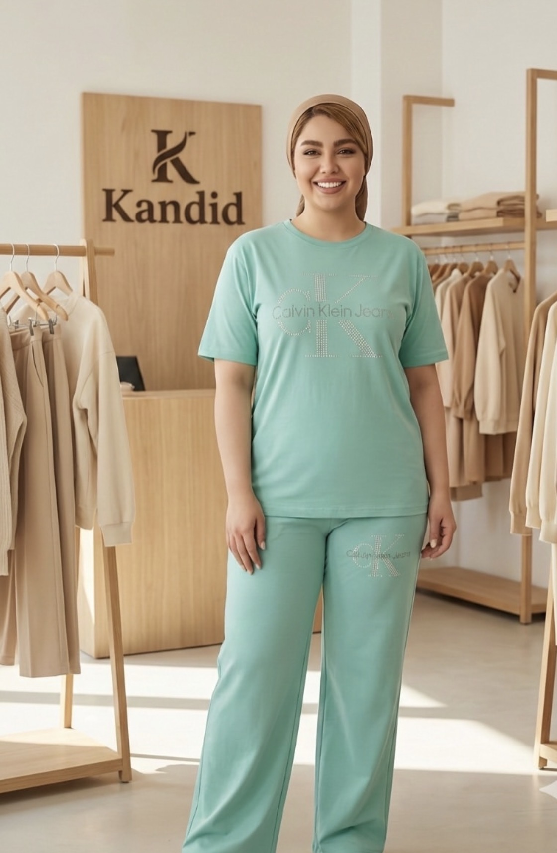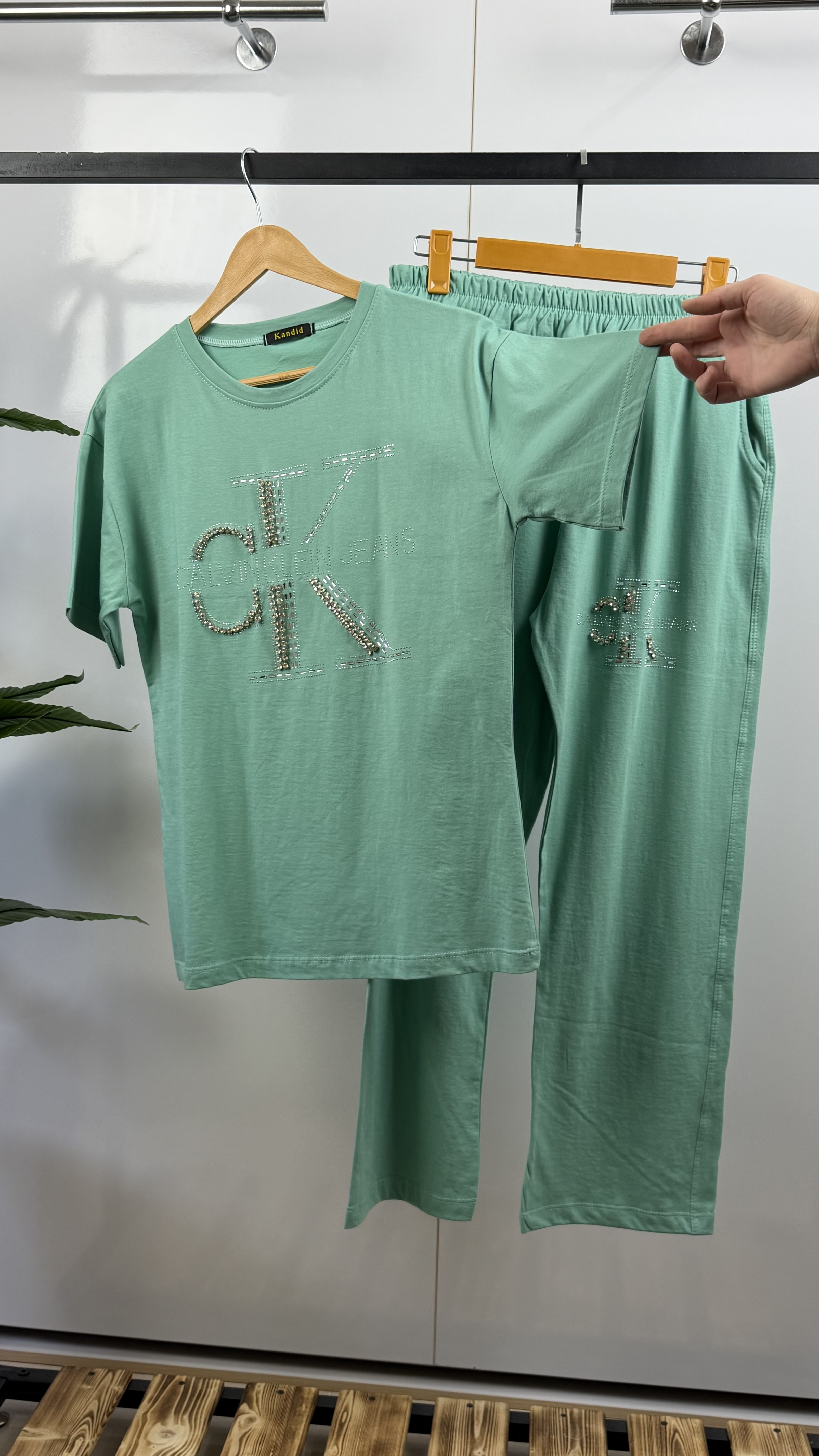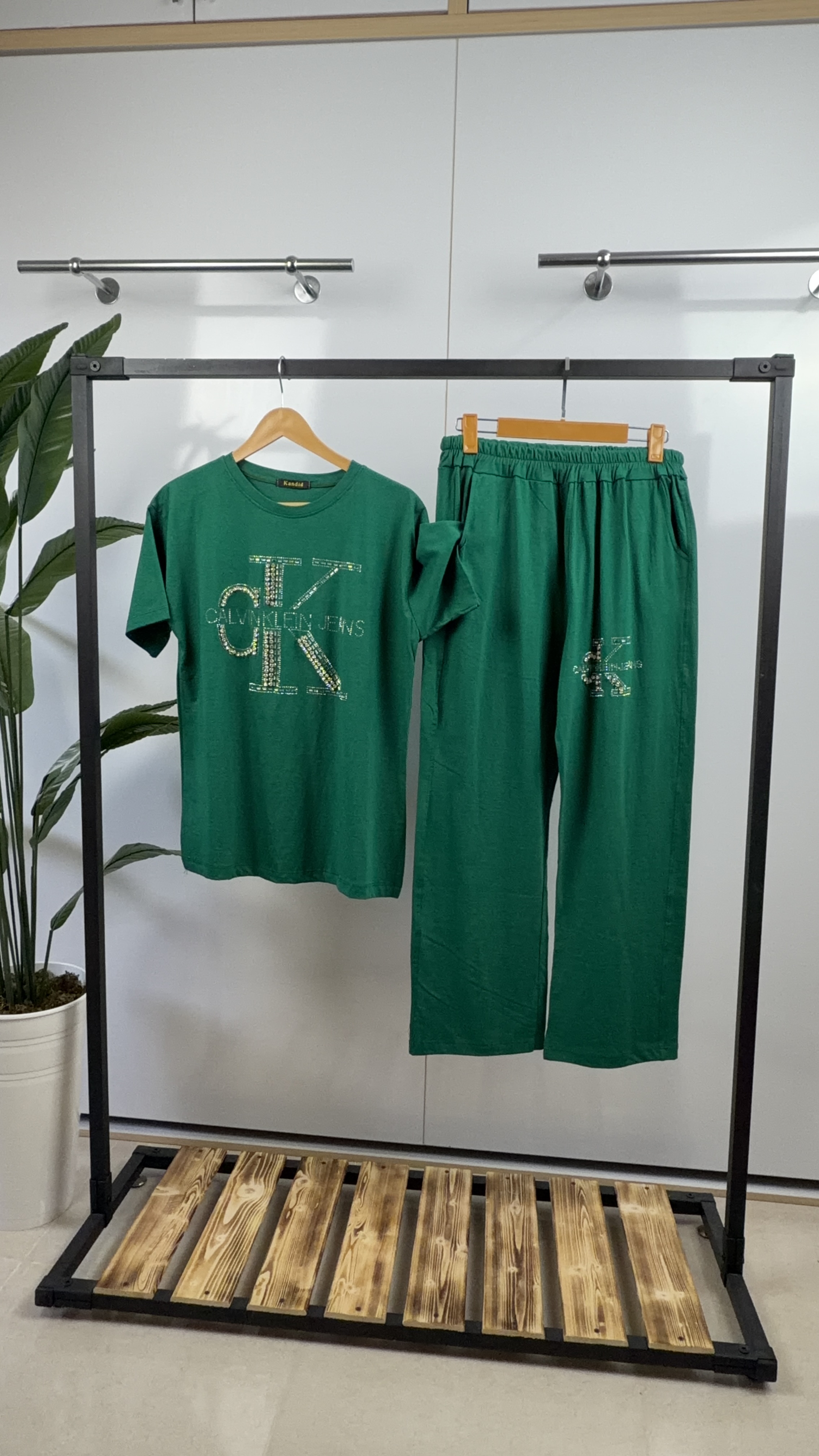 جلوی تیشرت و روی ران شلوار نوشته CK با ترکیب سنگ و نگین بسیار لباس رو خاص و جذاب تر کرده